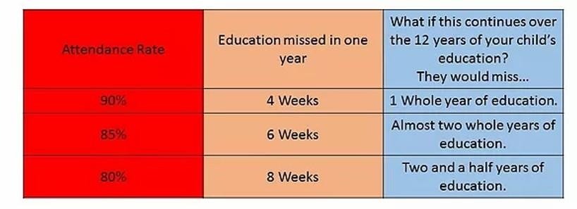 ​Taking a day here and there can disrupt several weeks of learning over time. The table below shows how percentages translate into weeks lost from the academic year: